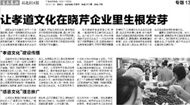 2014年1月24日,以曉芹企業(yè)孝道、感恩文化為主題,半島晨報(bào)社區(qū)報(bào)做了詳細(xì)報(bào)道“孝道文化”建設(shè)傳播王曉芹董事長對(duì)員工常掛在嘴邊的一句話說的好:“人的一生有三件事情不能等:學(xué)習(xí)不能等,健康不能等,孝敬不能等?!逼鸪?,王總基于自己個(gè)人情懷最先將孝道文化引入公司…